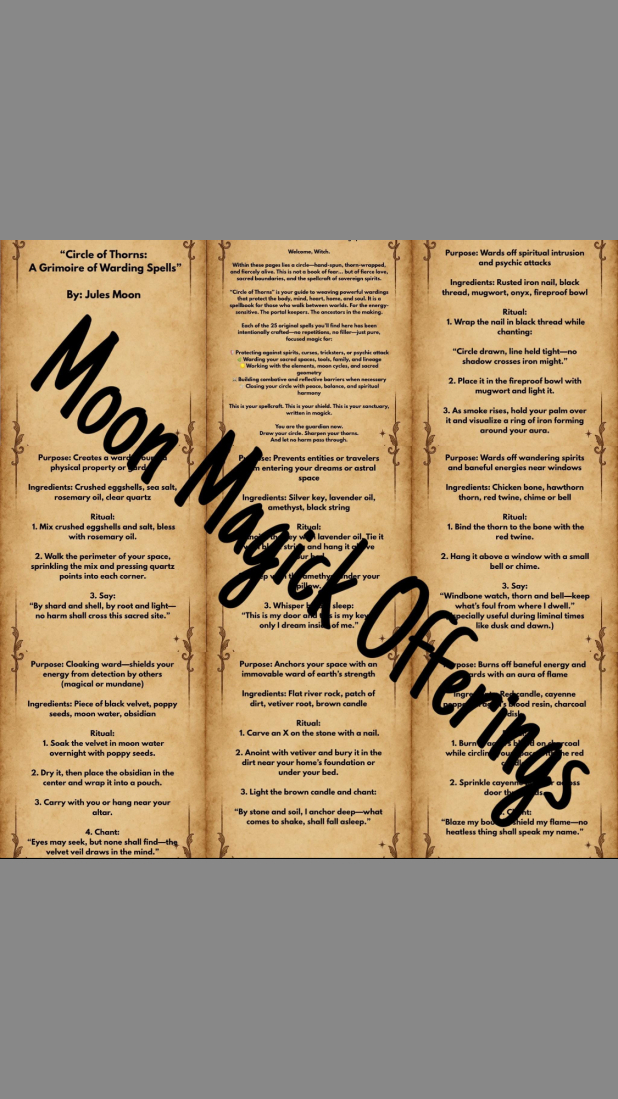 Step into a fortress of your own making with “Circle of Thorns,” a spellbook unlike any other. This 25-page grimoire is a masterwork collection of unique warding spells for witches, energy workers, and spirit keepers who desire true, lasting spiritual defense.