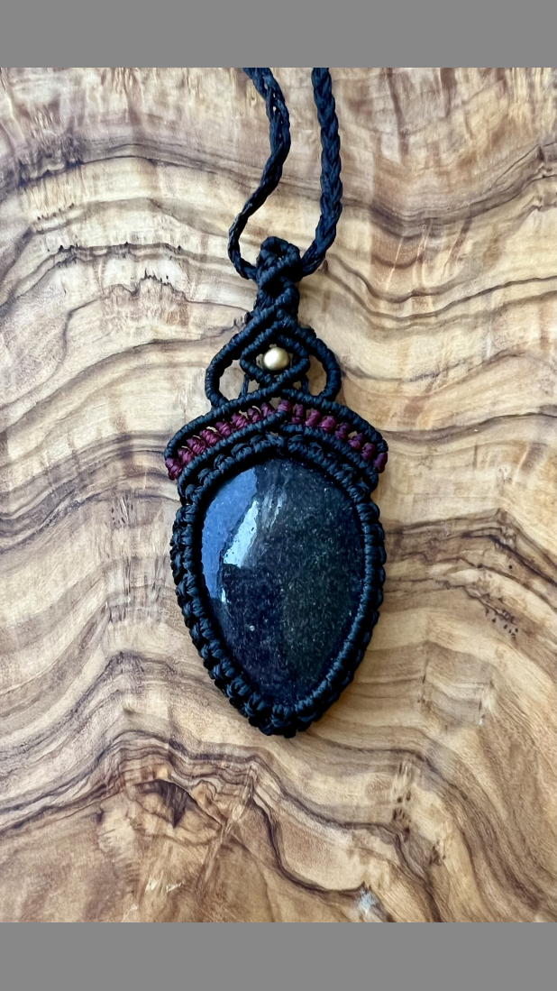 Bound to a handmade, macramé very dark moss agate pendant