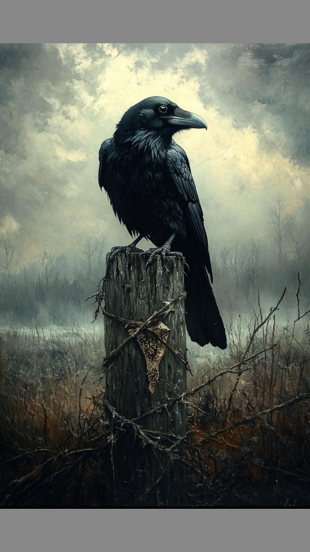 Ravaryn is a 205-year-old raven familiar, aligned with the Gray Arts—a balance between shadow and light, wisdom and mischief. His feathers gleam like polished obsidian, touched with a faint shimmer that flickers like distant lightning when the moonlight catches them. His eyes, sharp and unyielding, hold the patience of centuries spent observing the shifting tides of human fate.