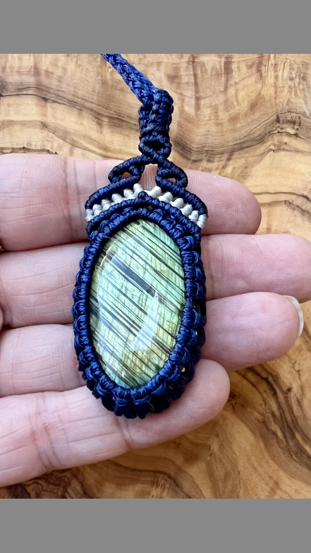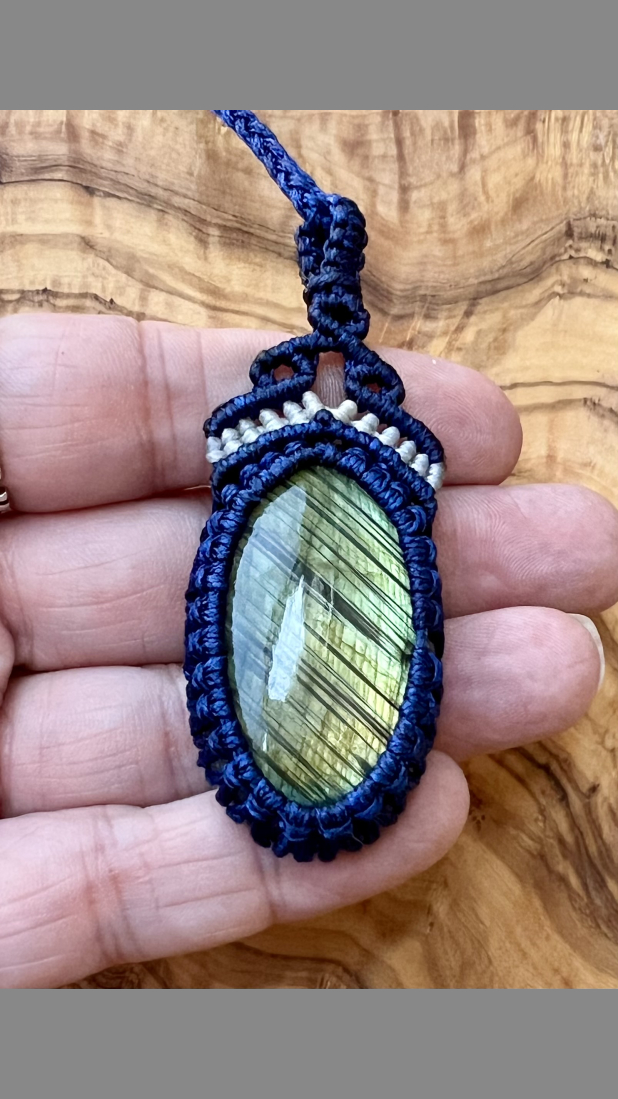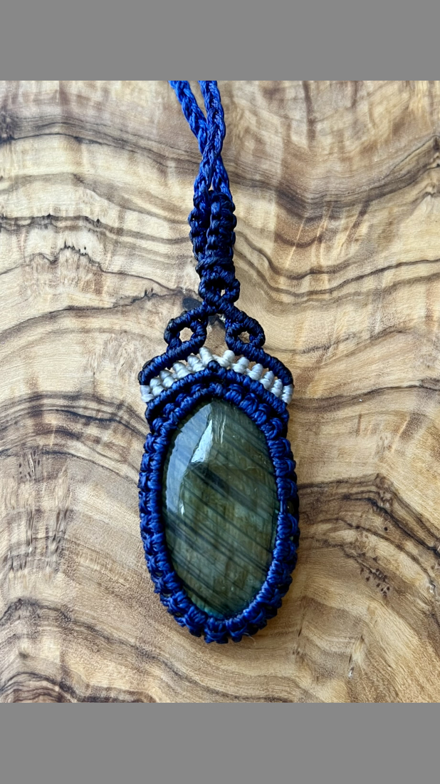 Bound to a genuine labradorite, handmade macramé pendant