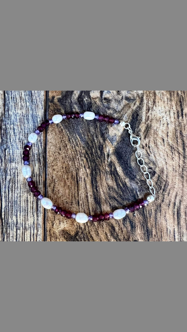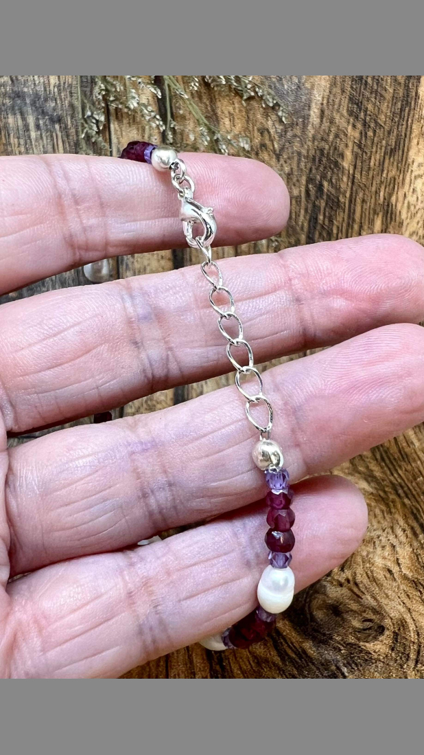 Unique Fancy .925 Sterling Silver 25cttw Hand Cut Garnet, Lab Tanzanite and Pearl Bracelet