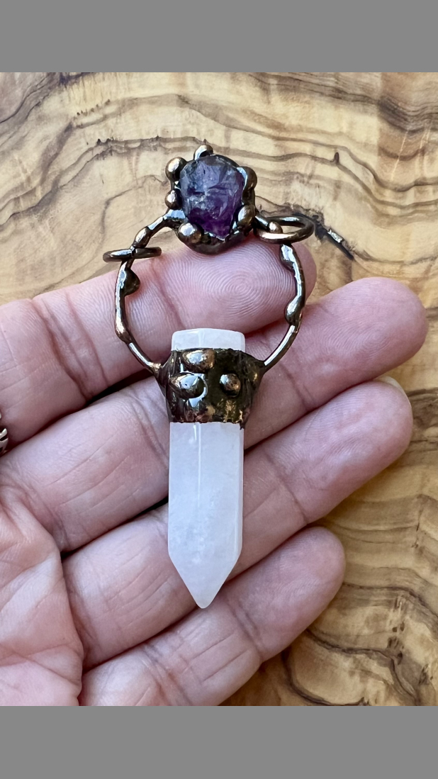 Bound to a amethyst and quartz, copper electroplated pendant